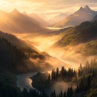 Majestueuze bergen ontvouwen zich tegen een schilderachtige achtergrond, gehuld in gouden lichtstralen die doordringen in de vroege ochtendmist. Een zachte rivier kronkelt door de weelderige, groene valleien, terwijl het silhouet van de bomen danst in het zachte licht. Dit vredige landschap straalt een ongerepte schoonheid en de rust van de natuur uit.