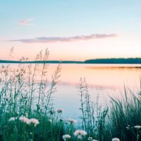 De lucht schittert in zachte pastelkleuren boven een glinsterend waterlichaam en weerspiegelt de kalme avondstemming. Fijne grassen en bloeiende wilde bloemen omzomen de oever en geven het landschap een vleugje levendigheid. Elke penseelstreek van de natuur creëert een harmonieuze compositie die uitnodigt om te blijven hangen en de ziel tot rust brengt.