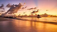 De oceaan kust zachtjes het Maldivische strand terwijl de zon opkomt boven de horizon en kleur geeft aan de hemel, en de pier die zich uitstrekt over de zee in het licht zet.