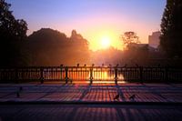 Prachtige sfeervolle opname tijdens zonsopkomst van een brug met duiven erop in Amsterdam