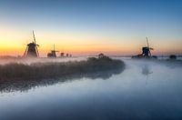 Ochtendsfeer bij de molens van Kinderdijk met lichte mist over het water.