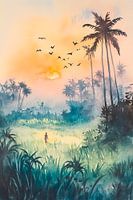 In het zachte licht van de schemering voert een mystiek landschap je mee naar tropische oorden. Hoge palmbomen strekken zich uit naar de hemel, terwijl in de verte een man mysterieus door het weelderige groen wandelt. Vogels fladderen tegen de donkerblauwe lucht, die is bezaaid met felle zonnestralen en een betoverende rust uitstraalt.