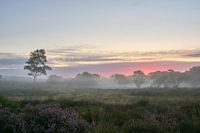 Nog voor zonsopkomst op de bloeiende heide. De zon die eraan komt schijnt rood tegen de bewolking. Dat en de grondmist zorgen voor een sfeervolle ervaring.