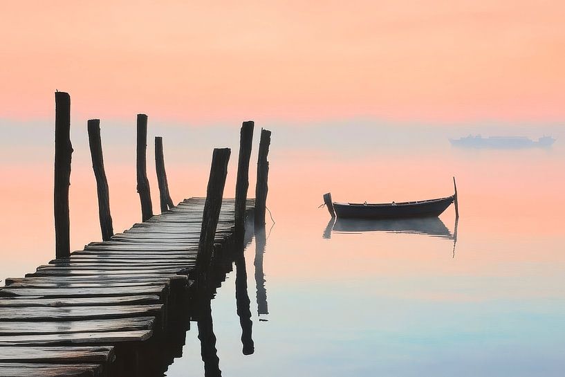 Een zachte zonsopgang hult het landschap in een warm pastellicht, terwijl de kalme steiger naar het water leidt en het silhouet van een eenzame boot een stille getuige is van vredige momenten. Deze harmonieuze compositie brengt rust en sereniteit in elke woonkamer en creëert een perfect toevluchtsoord voor ontspannende uren.