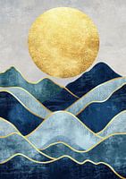 Dit moderne kunstwerk toont een abstracte interpretatie van bergen en de zon of maan, met een duidelijke invloed van Japanse schilderkunst. Het straalt zowel sereniteit als kracht uit.