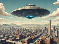 "Daglicht Ontmoeting: UFO Boven Main Street" is een perfect kunstwerk voor liefhebbers van vintage kunst, retro cultuur, en sciencefiction. Dit stuk brengt een unieke en intrigerende sfeer in elke ruimte, of het nu je woonkamer, kantoor of studeerkamer is. Het kunstwerk nodigt je uit om terug te keren naar een tijdperk waarin de verbeelding de vrije loop had en de mysteries van het universum voor het grijpen lagen.