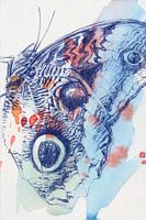 Tekening in blauwe inkt op mixed media van een dagpauwoog.