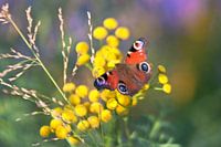 Deze prachtige, herfstachtige opname van gele wilde bloemen en een prachtige pauwvlinder in het gouden, warme herfstlicht geeft elke woon- en werkruimte een aangenaam warme, kleurrijke sfeer. Deze foto is gemaakt met de NIKON D90 (objectief: NIKKOR 80,0-200,0 mm f/2,8) in het Botanische Volkspark in Blankenfelde-Pankow op 16 oktober 2018 in de late middaguren.