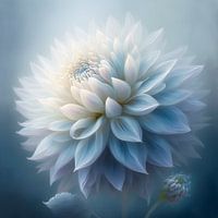 Close-up van een Dahlia bloem in lichtblauw en crème tinten met een zachte belichting en sfeer.