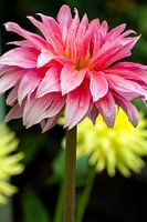 Deze roze dahlia met dauwdruppels steekt mooi af tegen de groene achtergrond met gele bloemen.