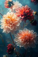 Dit kunstwerk onthult een betoverende compositie van dahlia's, badend in een mysterieus teal licht. De bloemen, variërend van zacht wit tot levendig oranje en diep rood, lijken te zweven in een etherische ruimte. Hun delicate petalen zijn met uiterste precisie weergegeven, waardoor een bijna tastbare textuur ontstaat. Het spel van licht en schaduw creëert een dromerige sfeer, alsof de bloemen onder water zweven of in een nevelachtige dageraad ontwaken. De zachte overgangen tussen de kleuren en de subtiele gloed rond de bloemen nodigen de kijker uit om in deze serene wereld te stappen, waar tijd lijkt stil te staan en schoonheid in elk detail te vinden is.