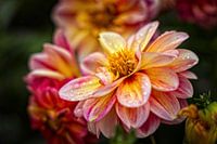 Close-up van een rood-gele Dahlia bloem.