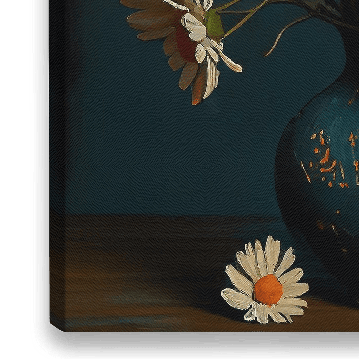 Stilleven van een olieverfschilderij van madeliefjes. In de stijl van de oude meesters. Olieverf op doek. Mooie warme kleuren en prachtig lichtinval. Passen bij diverse stijlen en trends. Stilleven.
