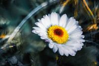 Madeliefje met een nog korte bloemsteel in de eerste dagen van de lente. De bloem heeft een interessant, tweekleurig centrum. Macrofotografie, meervoudige belichting.