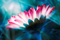 Macrofotografie van een madeliefje tegen het licht. De speciale opnametechniek van meervoudige belichting in de camera en de speciale turquoise kleur van de achtergrond geven de foto een mystiek en mysterieus effect.