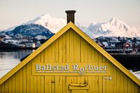 Een pittoresk dakje met schoorsteen in een fel gele kleur. Op de achtergrond zijn de besneeuwde bergketens van de Lofoten te zien.