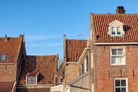 Historische huizen in Enkhuizen met traditionele rode dakpannen en bakstenen gevels, gefotografeerd in de straat De Bocht.