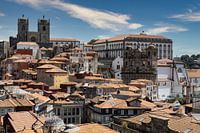Panorama, stadsgezicht van Porto, Portugal, met rode daken en kathedraal in de achtergrond op een licht bewolkte dag.