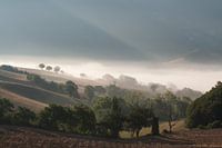 Dauw in de vroege ochtend in combinatie met de opgaande zon geeft een mooi beeld van het dal waar het dorpje Gubbio in de Marken, Italië in ligt.