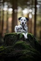 Dalmatiër hond (wit met zwarte stippen) liggend op een met mos begroeide boomstam in een donker en groen bos. Een mooi foto geschikt voor een prachtige afdruk, poster of als andere wanddecoratie aan de muur.
