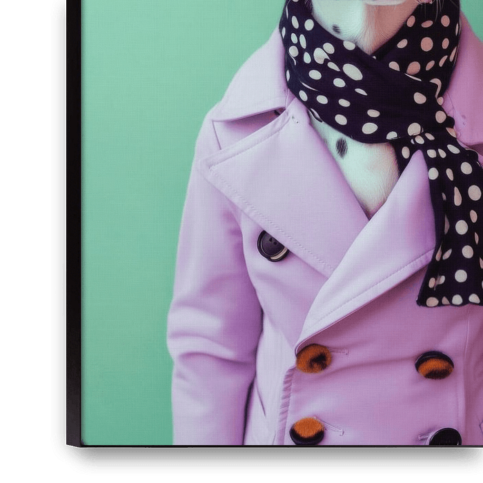 In een stijlvolle, lavendelkleurige jas en een speelse zwarte hoed is deze charmante dalmatiër met zijn opvallende, gevlekte vacht een echte modekenner. Gewikkeld in een elegante sjaal straalt hij een onmiskenbare elegantie en nonchalante verfijning uit die elke toeschouwer weet te boeien. Een blikvanger die stijl en charisma combineert!