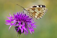 Een schaakbordvlinder is op zoek naar nectar op een vlokkerige bloem.