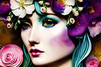 Vrouw met blauwgroen haar en roze bloemen.