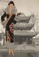 Dame in jaren 20 stijl kleding met fleur chinoise voor de Loongwa tempel in Shanghai, China.