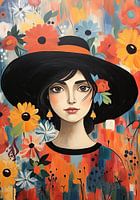 Dame in Bloemenzee | Portret Bloemenschilderij - Dit schilderij kenmerkt zich door een portret van een vrouw met grote, sprekende ogen, subtiel bekroond door een elegante zwarte hoed met een kleurrijke bloemdecoratie. Ze is omringd door een weelderige bloementuin, levendig weergegeven in een palette van voornamelijk warme tinten oranje,…