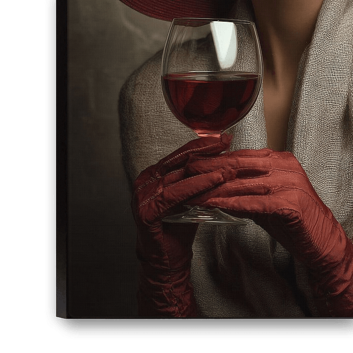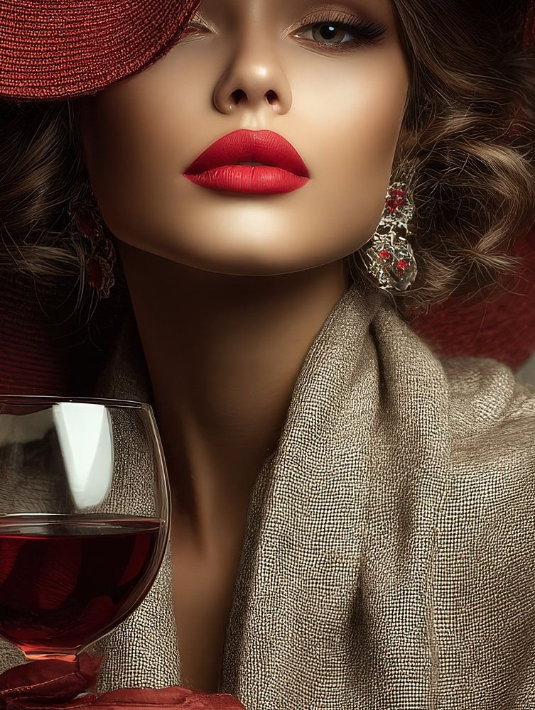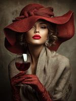 Stijlvol portret van een vrouw met een grote rode hoed en een glas wijn. De warme rood- en bruintinten geven het werk een luxe en moderne uitstraling. De rustige achtergrond en het zachte licht zorgen voor een tijdloze sfeer.