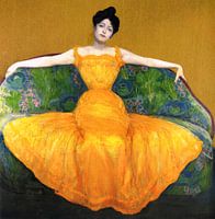 Dame in de gele jurk van de Oostenrijkse Max Kurzweil die in jugendstil stijl zijn vrouw Martha vereeuwigde. Aan deze versie is een gouden achtergrond gegeven. Kunst met een knipoog!
