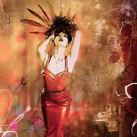 Dame in het rood - een vrouw in een rode leren jurk omhelst haar krullende haar, ze leunt een beetje verleidelijk voorover - een foto met een beetje erotiek.