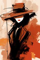 Dame met Hoed | Modern Portret - Dit stijlvolle schilderij portretteert een persoon in een oversized hoed, gebruikmakend van een beperkt kleurenpalet dat voornamelijk uit rood- en bruintinten bestaat. De expressieve penseelstreken en abstractie geven een moderne touch, terwijl de prominente hoed en silhouet een gevoel van mysterie en elegantie uitstralen.