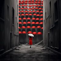Abstracte scene met gebouwen en een grijze muur met heel veel rode paraplu's. Een dame met grijze paraplu kijkt naar de muur.