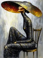 Elegant portret met glinsterende gouden hoed en sereen silhouet. Eigentijds schilderij dat elke kamer verandert in een stijlvol statement.