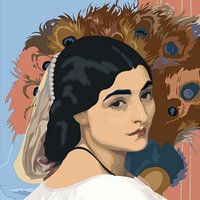 Dame met pauwenveren, een schilderij gebaseerd op kunstwerken van de Oude Meesters, door mij geherinterpreteerd in actuele trendkleuren.