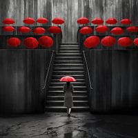 Dame met rode paraplu begint aan een trap met leuning naar andere rode paraplu's.