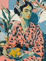 Een modern portret van een vrouw in krachtige koraaltinten, met een schaal citroenen in de hand. Gemaakt met dikke, expressieve paletmesstreken, combineert het kunstwerk elegantie en emotie in een eigentijdse abstracte stijl.