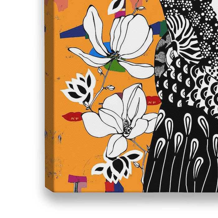 Deze zwart-wit tekening is geïnspireerd op 'Dame met waaier' van Klimt en heeft een moderne twist. De elegante vrouwenfiguur, die doet denken aan het origineel, steekt af tegen een levendige en abstracte oranje achtergrond. De speelse, getextureerde achtergrond voegt diepte toe en creëert een dynamisch contrast met de monochrome afbeelding, waardoor een tijdloze klassieker nieuw leven wordt ingeblazen.