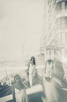 Zomers straatbeeld in Knokke-Heist langs de zeedijk. Dames in witte zomerse kleding flaneren langs de wandelboulevard aan het strand met een mooie lichtval en reflectie.