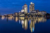 Het zakendistrict van Omval spiegelt zich in de Amstel tijdens het blauwe uur