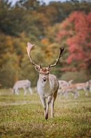 Een damherten bok gefotografeerd met prachtige herfstkleuren in de achtergrond. Op de achtergrond is ook de rest van de kudde aanwezig