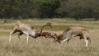 Twee mannetjes damherten in gevecht tijdens de bronsttijd in de herfst. Geweien kletteren tegen elkaar en er word beslist wie de sterkste is.