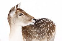 Portret van een damhert in de sneeuw waardoor er een mooie witte achtergrond ontstond zonder storende elementen in beeld. De aandacht van de kijker gaat zo compleet naar het onderwerp uit en levert een rustig beeld op voor de kijker. Dit diertje leek niet aangedaan door de winterse buien en het dikke pak sneeuw maar stond ontspannen en nieuwsgierig te kijken wat ik aan het doen was, waardoor ik de kans kreeg het mooie dier te portretteren. Door de witte sneeuw achtergrond komen de kleuren mooi naar voren.