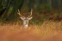 Een damhert (Dama dama) steekt zijn kop boven het gras. De herfst heeft het gras mooi doen kleuren.
