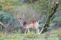 Dit is toch kunst. De manier waarop het jonge damhert staat bij de schuin groeiende boom. Een plaatje.