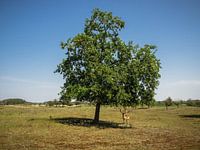 onder een boom staat een Damhert, deze zit de bladeren te eten die aan de boom groeien.