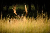 Een damhert lopend door het hoge gras. Door een laag standpunt is het hert in het gras "opgenomen".