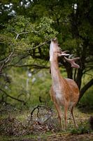 Damhert steekt zijn nek uit om te kunnen eten van groen blad uit de boom.