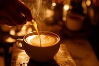 Een dampende mok koffie, omgeven door warm licht, straalt gezelligheid en genot uit. De delicate beweging van het toevoegen van melk creëert artistieke patronen die het moment van ontspanning weerspiegelen. Dit kunstwerk vindt zijn perfecte plaats in de keuken of eethoek en nodigt je uit om samen met vrienden van een kopje koffie te genieten.